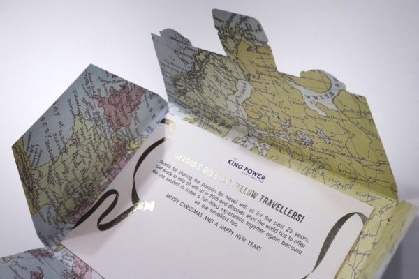 และประกบแผ่นการ์ดหนา พิมพ์ตัวคำอวยพรและ ปั๊ม foil เงิน เฉพาะจุด เพื่อเพิ่มความหรูหราเข้ากันทั้งชิ้นงาน